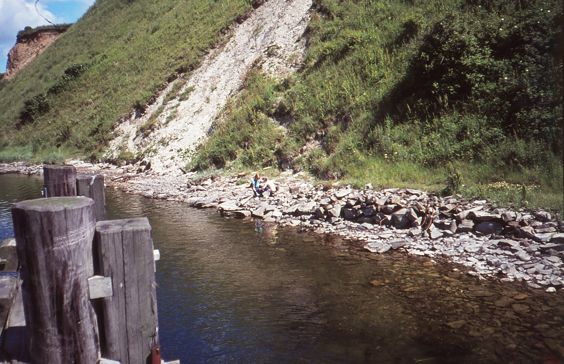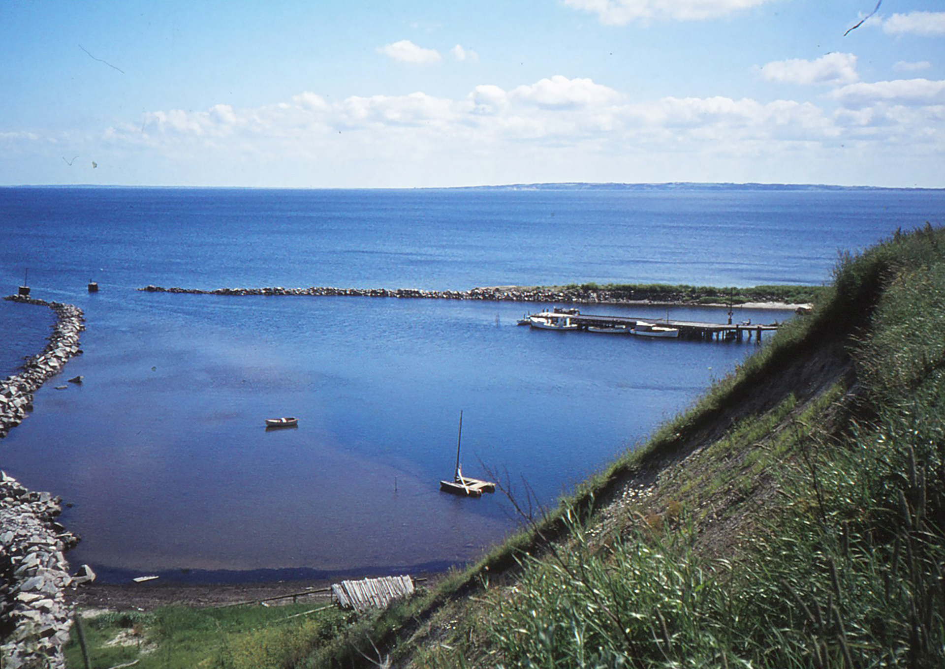 On another trip we spend some days at Ejerslev Harbour on Mors. Previously the harbour was used for shipping of mo-clay. My sister and I climbed the high slopes and ate wild strawberries. At the top we grilled bananas, while we looked down into the large mo-clay-pit. I found a piece of mo-clay with blue and orange-ochre colors. It looked like a prairie with a big blue sky.